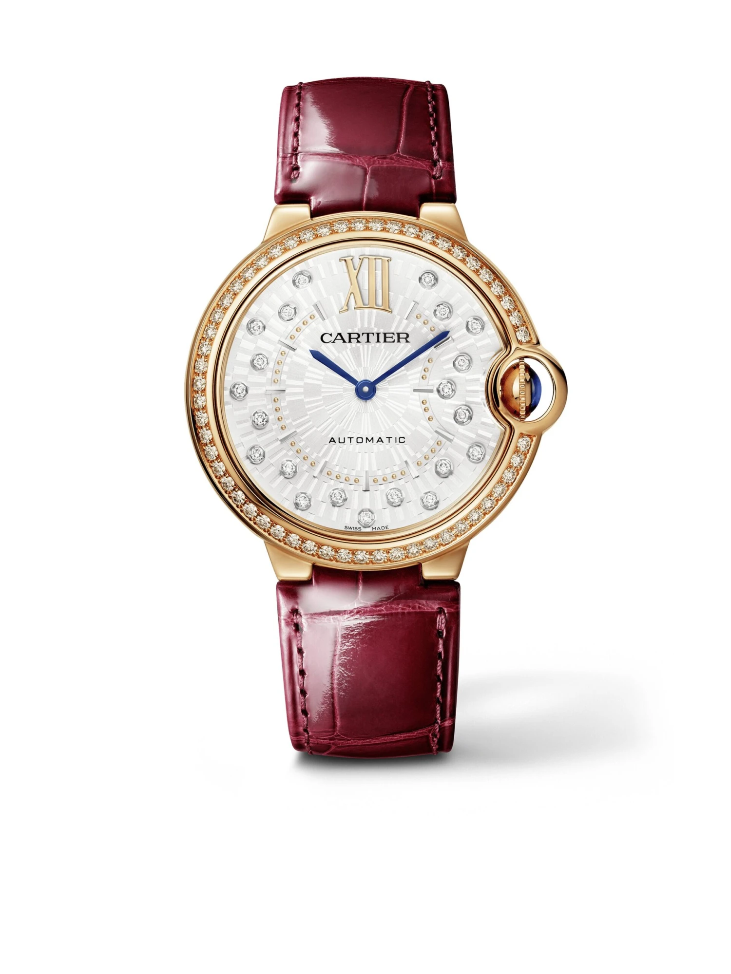 Ballon Bleu de Cartier watch, 36 mm. Self-winding mechanical movement. Rose gold 750/1000 case set with 54 brilliant-cut diamonds totaling 0.78 carats. Fluted crown decorated with a cabochon sapphire. Matt silvered stamped sunray dial set with 21 brilliant-cut diamonds totaling 0.19 carats. Blued-steel sword-shaped hands. Sapphire crystal. Burgundy alligator leather strap, rose gold 750/1000 ardillon buckle. Thickness: 0.47”. Water-resistant up to 3 bar (approx. 30 meters/100 feet).