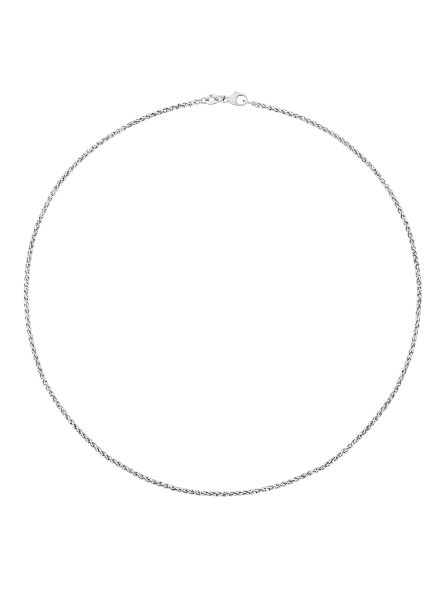 The sleek necklace in 18k white gold from the Basics by Wempe Classics line is a must-have item for any jewelry box. The fine plait chain has a diameter of 1.9 millimeters and length of 42 centimeters, and is worn close to the neck. It is therefore very well-suited for smaller pendants. The swivel-clasp lock ensures it is secure.