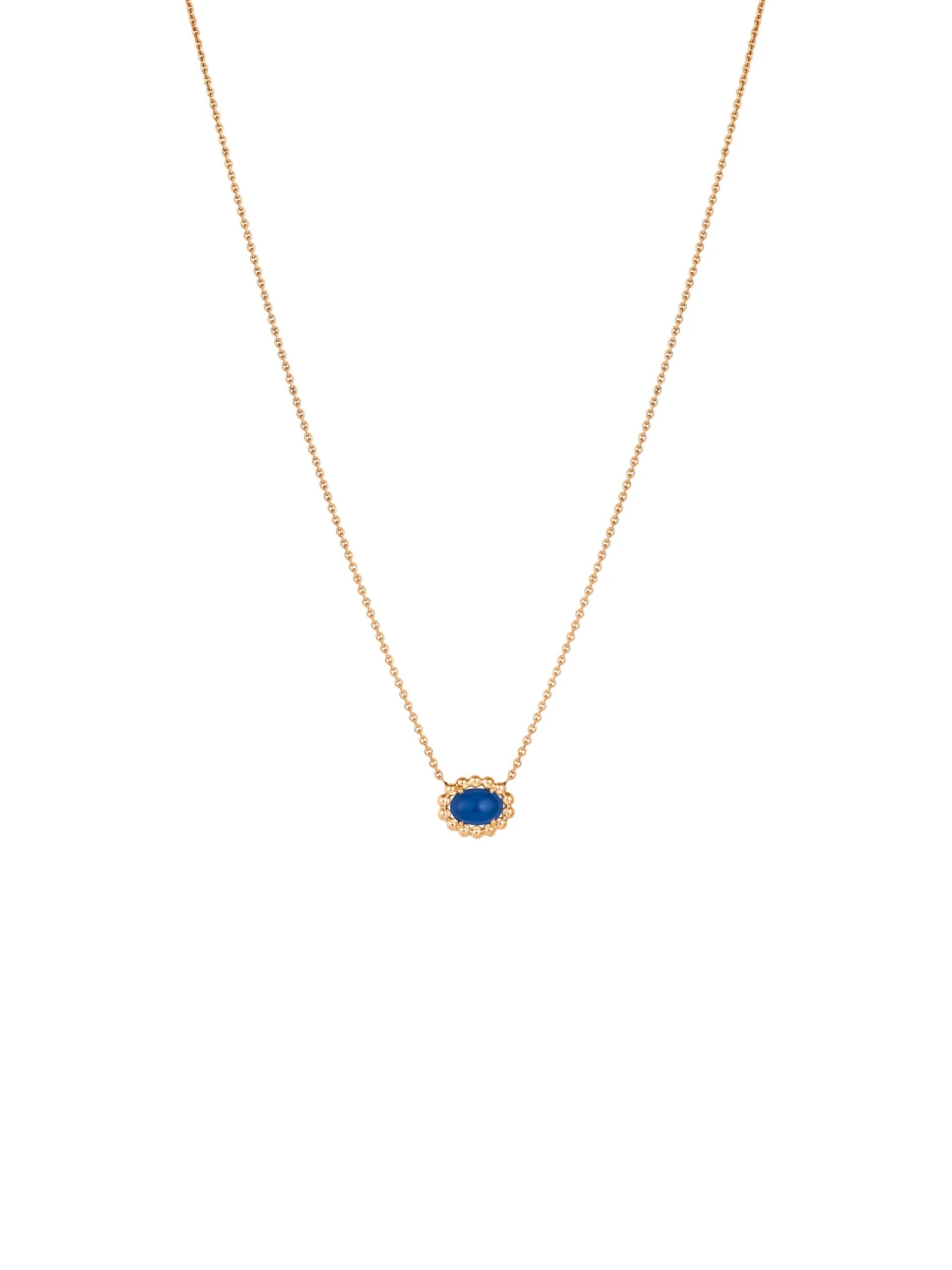 Soft curves in a delicate design. The Blu XS BY KIM pendant is a real eye-catcher with its intense blue agate in an oval shape. Surrounded by 14 orb-shaped elements in warmly shimmering 18k rose gold, which are characteristic of the Blu line, the colored gemstone shines even more intensely. The pendant comes on a 42-centimeter cable chain, also made of 18k rose gold. A piece of jewelry that adds an elegant touch to a business outfit as well as to a little black dress and harmonizes beautifully in combination with other necklaces.