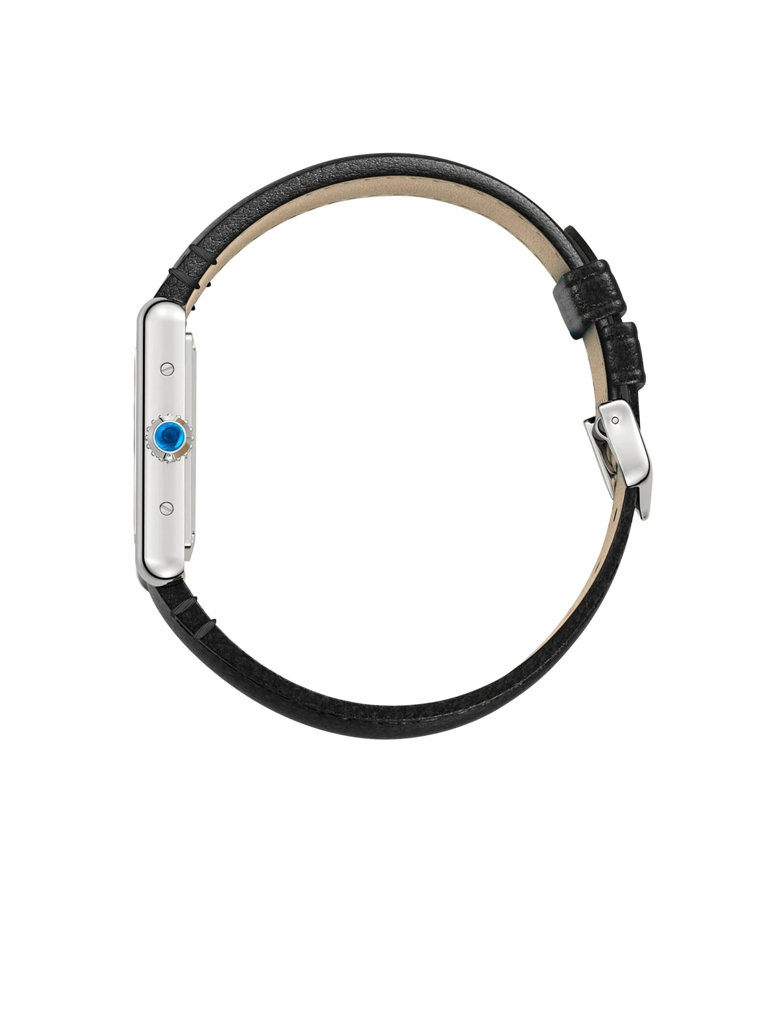 Tank Must watch, small model, photovoltaic SolarBeat™ movement. Steel case, beaded crown set with a synthetic cabochon-shaped spinel, silvered dial, blued-steel sword-shaped hands, black strap (made with non-animal leather), steel ardillon buckle. Case dimensions: 29.5 mm x 22 mm, thickness: 6.6 mm. Water-resistant to 3 bar (approx. 30 meters).
