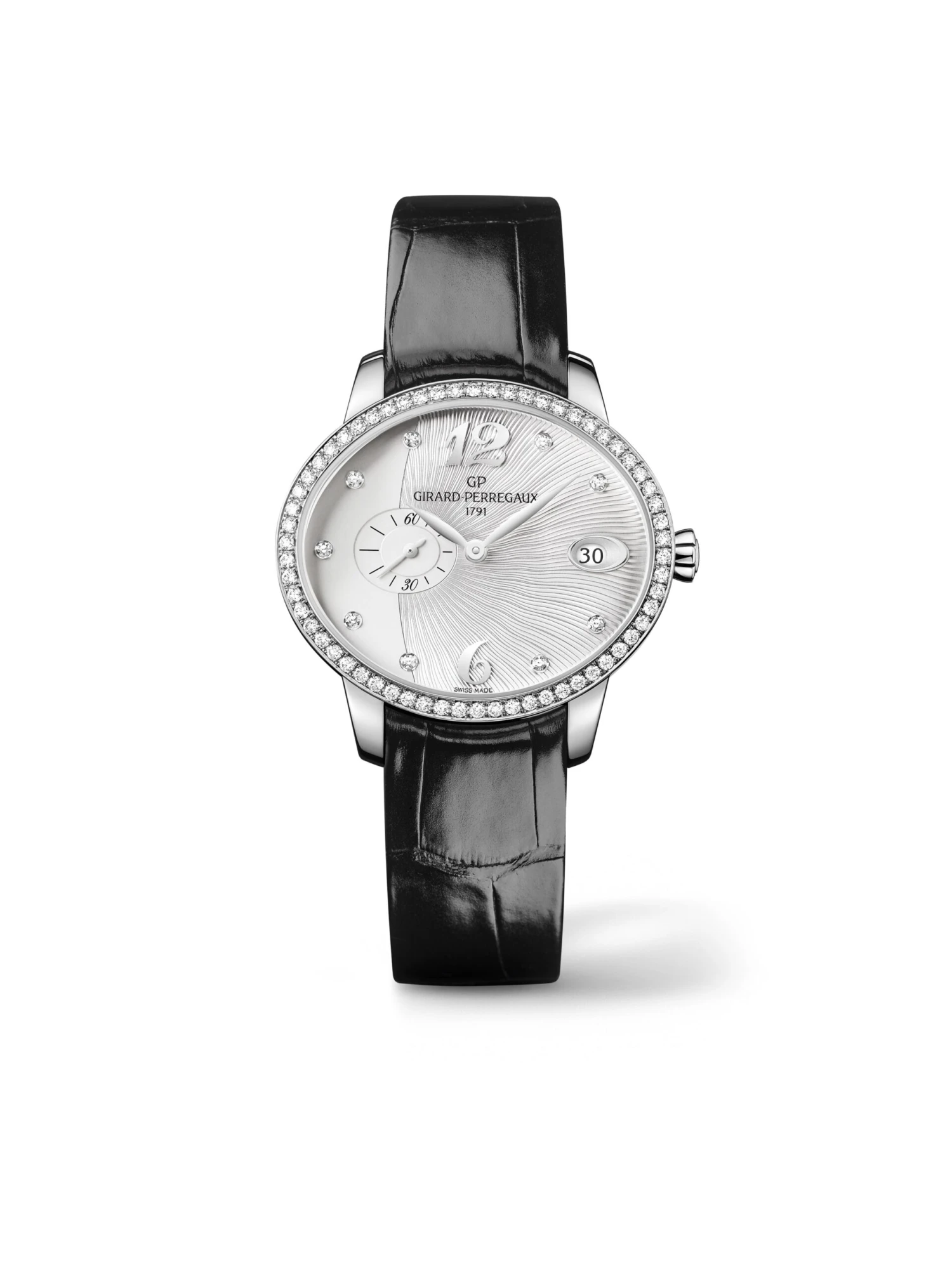 For more than ten years, the unique oval shape of the Cat’s Eye has embodied one of the most beautiful seductions for lovers of fine watchmaking. Exceptionally graceful, yet sparkling and fascinating in every detail, is the Cat’s Eye Small Second Ref. 80484D11A161-BK6B, whose dial reflects the rays of the sun in the form of a filigree decoration. The eponymous small second and date reflect the oval design of the 35.40 x 30.40 x 9.1 millimeter stainless steel case. Diamond hour markers and a diamond bezel add luxurious accents. The rhythm of the automatic manufacture caliber GP03300-0126 is followed by the leaf-shaped, delicately curved hands.