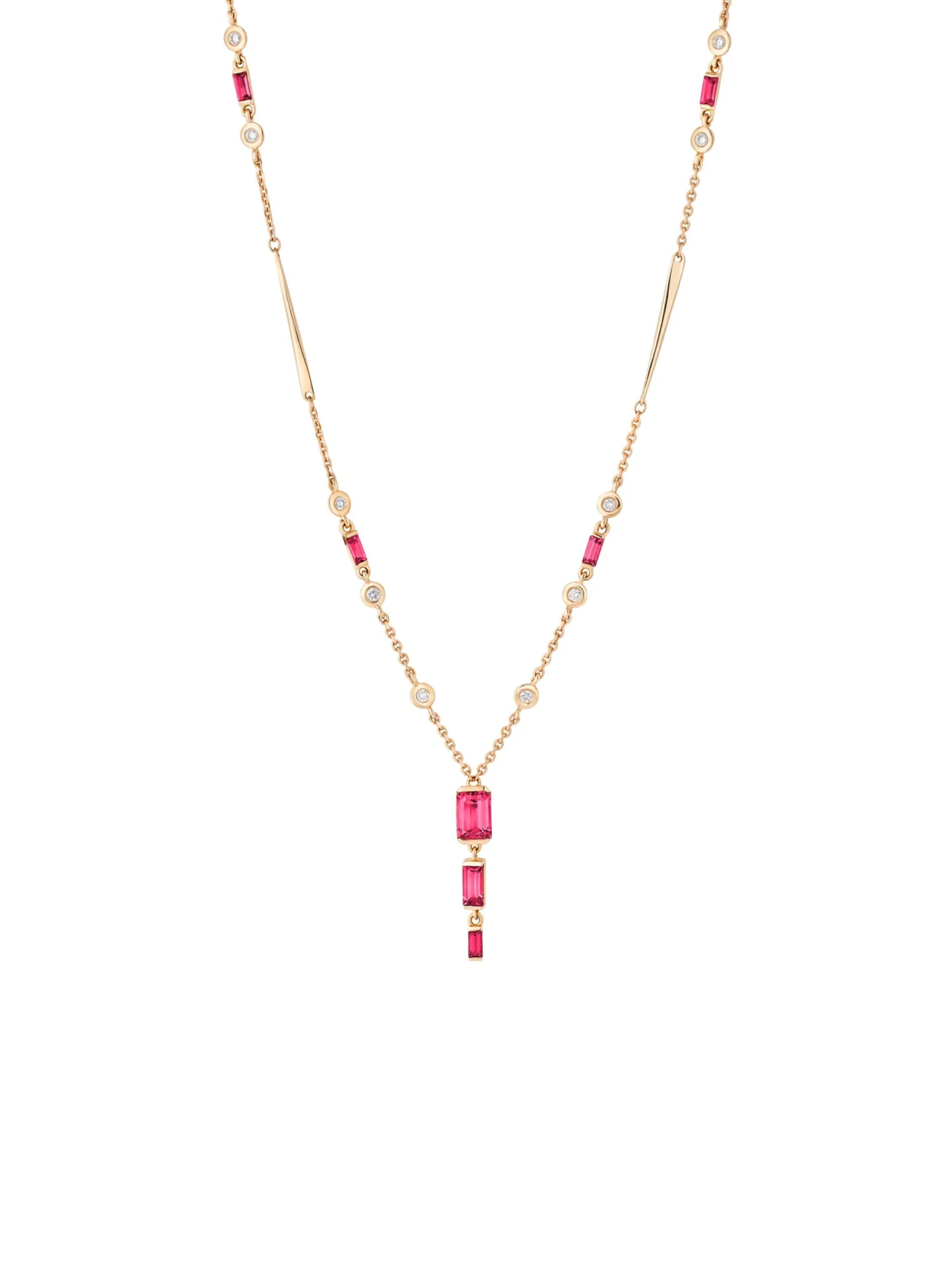 The Colonna Light BY KIM necklace distinguishes itself by a wonderful play of shapes and colors and combines different elements to form a harmonious overall composition. The pendant is a casual variant of the Colonna BY KIM line and stages exceptional colored gemstones in a contemporary and elegant way. An octagonal-cut pink tourmaline of 1.00 ct forms the necklace’s centerpiece is. It is flanked by further tourmalines in a baguette cut that are arranged like supporting columns. Ten brilliant-cut diamonds of 0.30 ct in total enhance the radiance of the colored gemstones and literally round off the design.