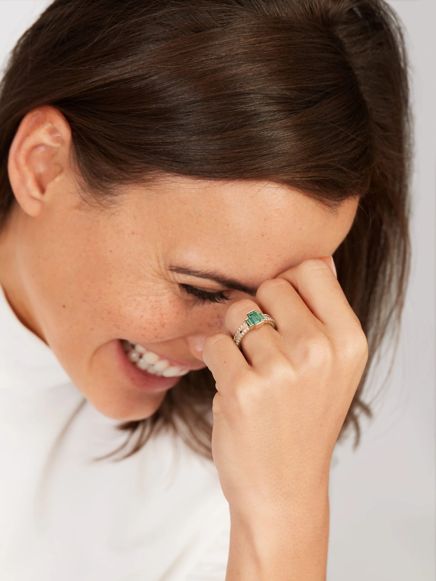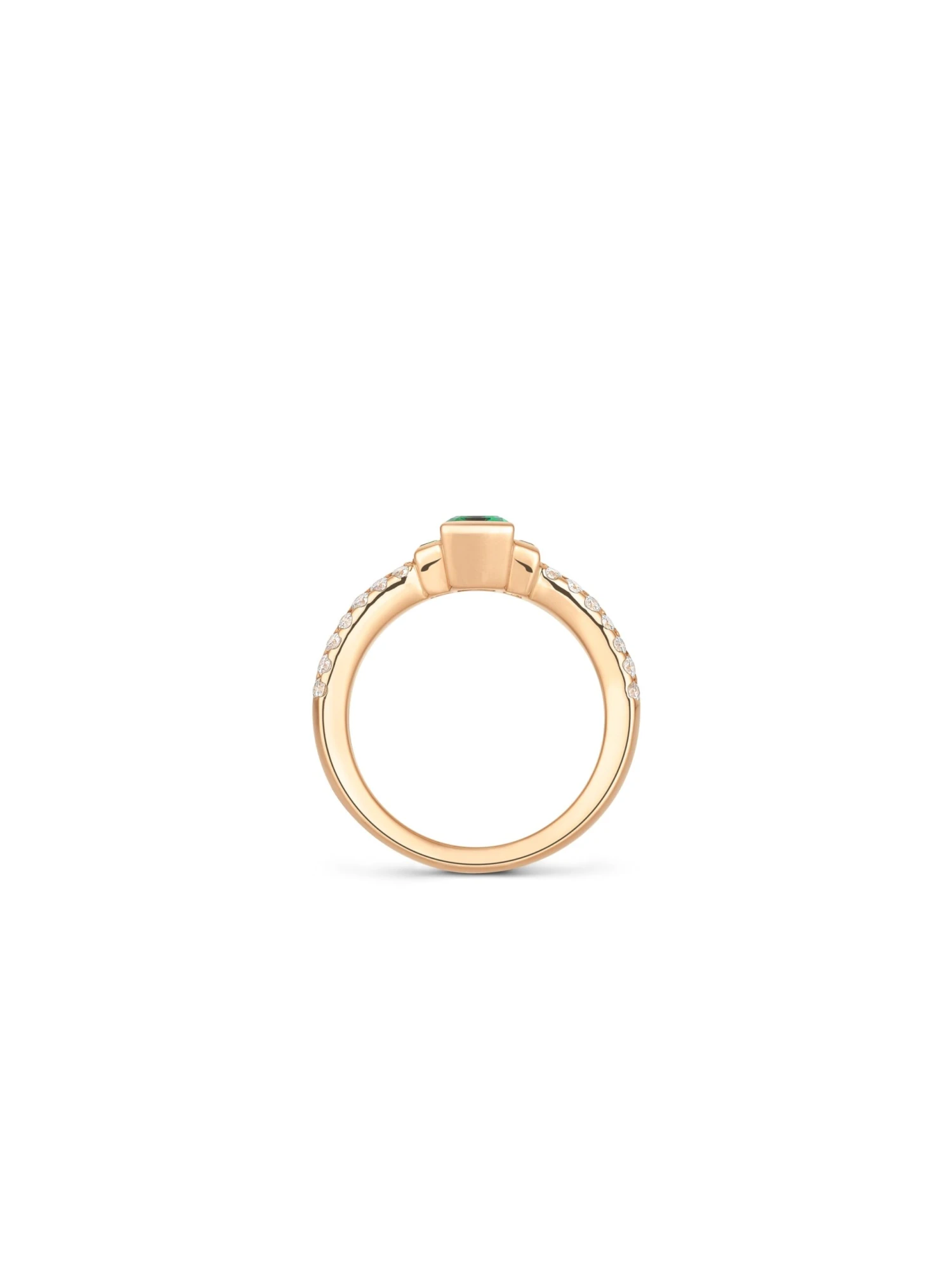 Pastel colors don’t only look tempting, they are also absolutely en vogue in fashion design and provide us with gorgeous outfits. The Colonna light BY KIM ring in 18k rose gold is set in its center with an octagonal-cut green tourmaline, which is flanked on both sides by a column-like tourmaline in a baguette cut. The edge of the ring band is adorned with 28 brilliant-cut diamonds of 0.42 ct in total that give this precious, fresh and contemporary ring additional glamour. It can also be beautifully combined with other rings.