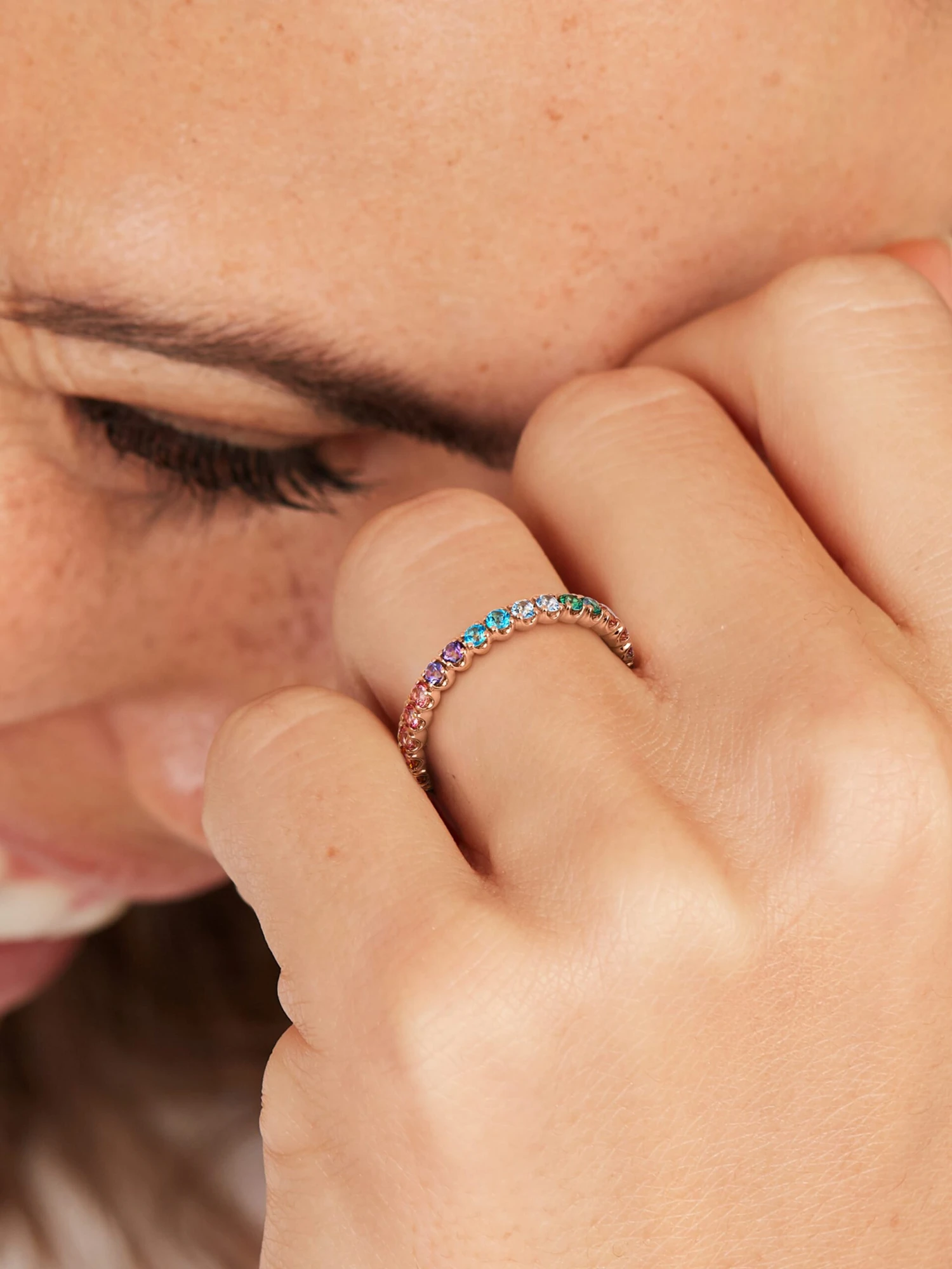 “There is a pot of gold at the end of the rainbow”. With the Electrify ring, our treasure hunt will come to an end: presenting itself in all colors of the rainbow, this ring inspires us with its lightness and takes us back to our childhood. 29 topazes, set in warm 18k rose gold, let us dream and give sparkle to our summer outfits.
