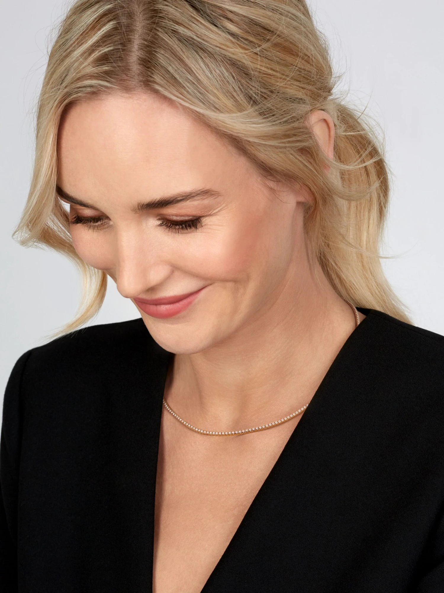 Made with love: The 42 centimeter Renaissance Everloving by Wempe Classics Rivière necklace embraces the neck as if it were tailor-made. This is due to its fine, flexible elements. It is adorned by It is adorned by 195 sparkling brilliant-cut diamonds 2.00 ct in total that line up elegantly lending this slim, 18k rose gold necklace its unique aura. A subtle heart detail near the clasp completes this simple and eternally beautiful declaration of love.