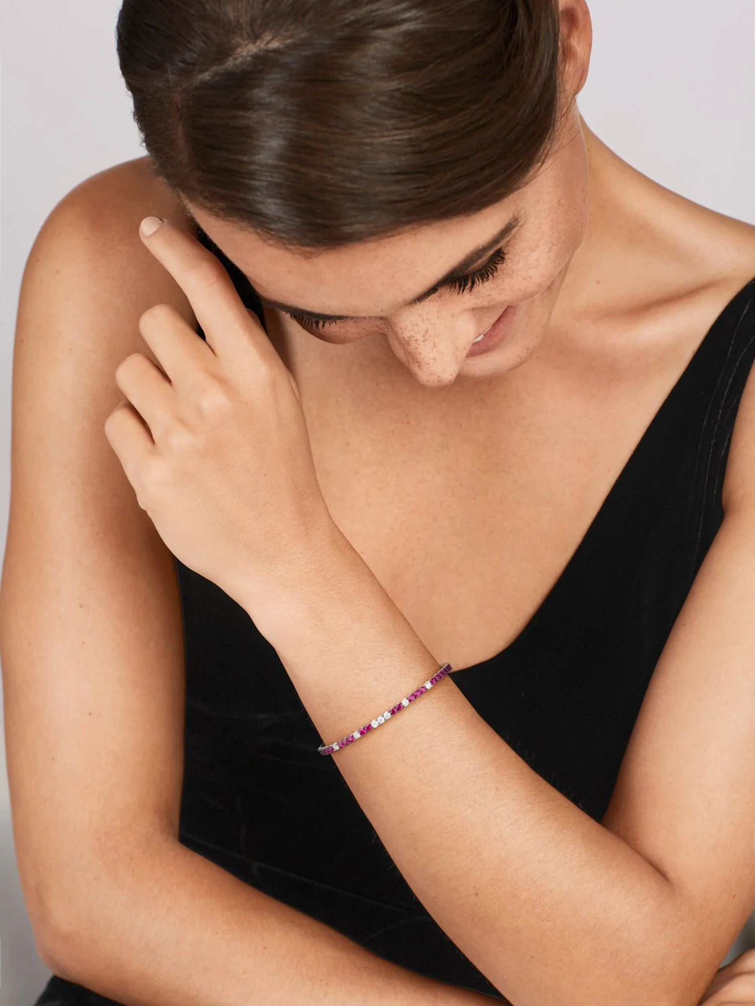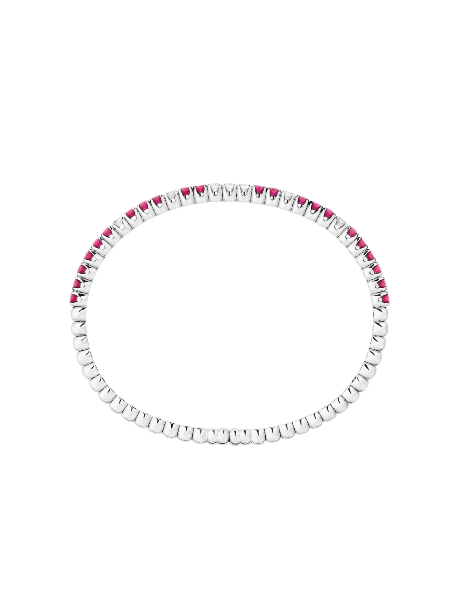 The ruby stands as a symbol of life and love and is skillfully set off with diamonds in the Everloving Rubies by Wempe Classics bangle. Twenty-two luminous red rubies totaling 2.46 ct and seven brilliant-cut diamonds weighing 0.64 ct radiate in dynamic alternation on the bangle. The piece of jewelry made of polished 18k white gold can be opened and closed by a practical magnetic clasp. A radiant gift with a loving message for a special occasion.