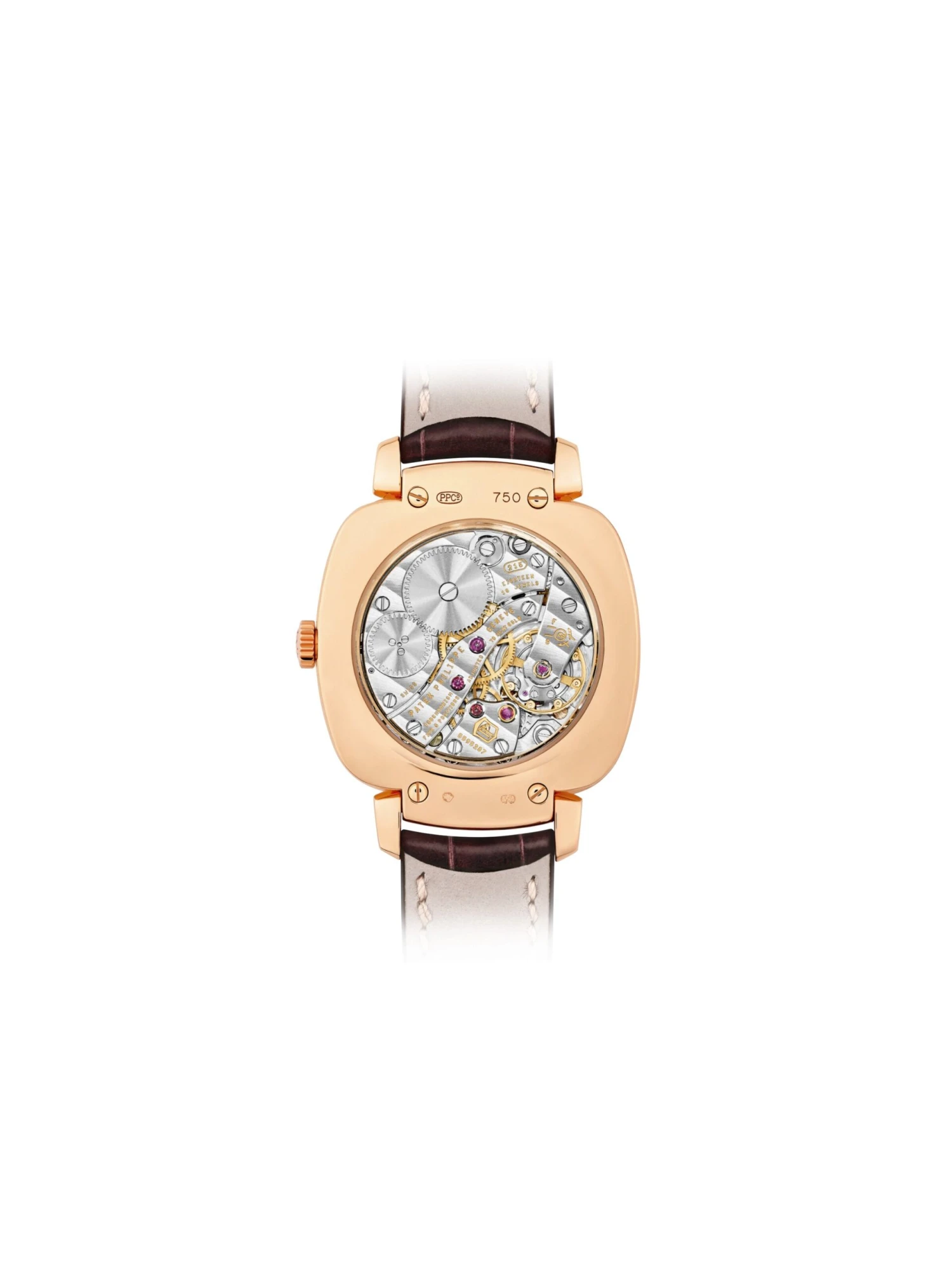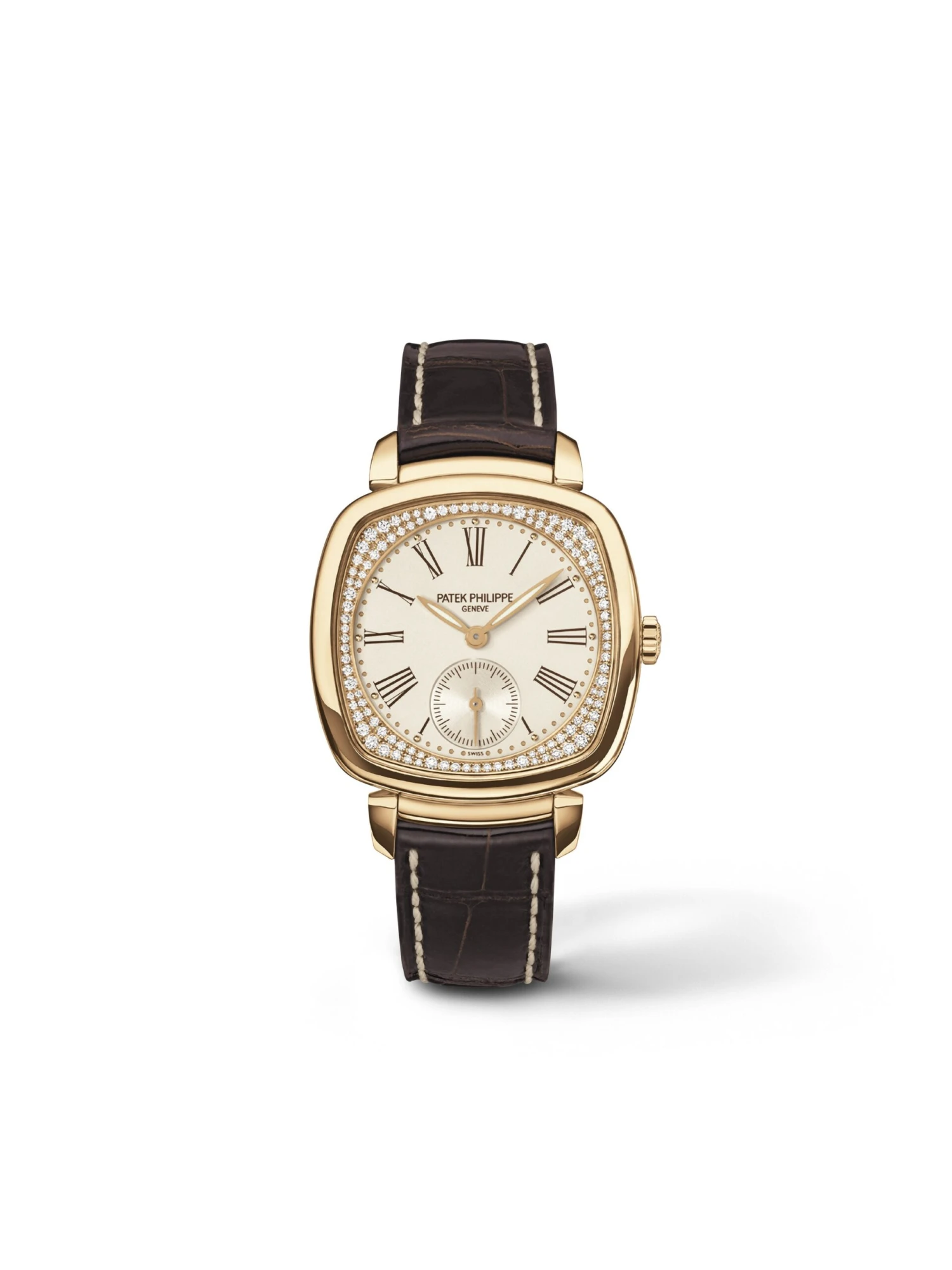 This Patek Philippe model, reference 7041R, captivates with a cushion-shaped case made of 18k rose gold and set with 108 diamonds (0.31 ct) around the dial. This ladies’ watch, with precise contours and timeless style, presents a very contemporary interpretation of art deco – representing the golden era of Patek Philippe. This watch with a hand-wound manufacture caliber is fitted with a brown alligator-leather strap.