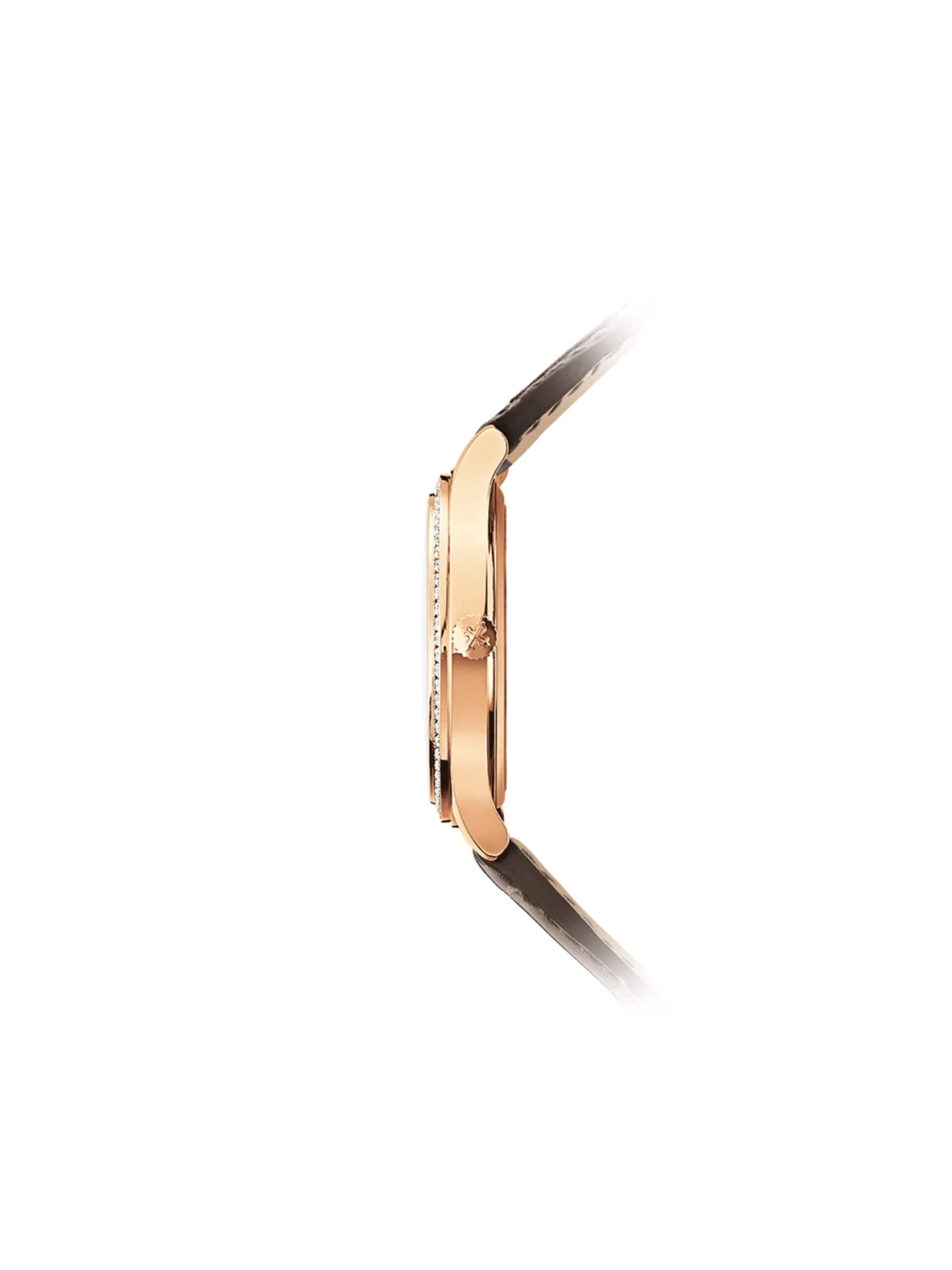 The Ladies First Perpetual Calendar, reference 7140R-001, is made for the sophisticated admirer of mechanics. Thanks to the small dimensions of the 240 Q caliber of legendary thinness – just 3.88 millimeters thick despite its 275 parts and miniature rotor made of 22k gold – the 35.1 millimeter case made of 18k rose gold has a slim profile of 8.7 millimeters. The bezel, set with 68 diamonds, encircles a silver-colored dial with sunray decoration, applied numerals, and minute pearls made of rose gold. It makes for a harmonious presentation of the perpetual-calendar model’s complete offering: day of the week, date, month, leap year, and moon phase, as well as 24-hour indicator with hands.
