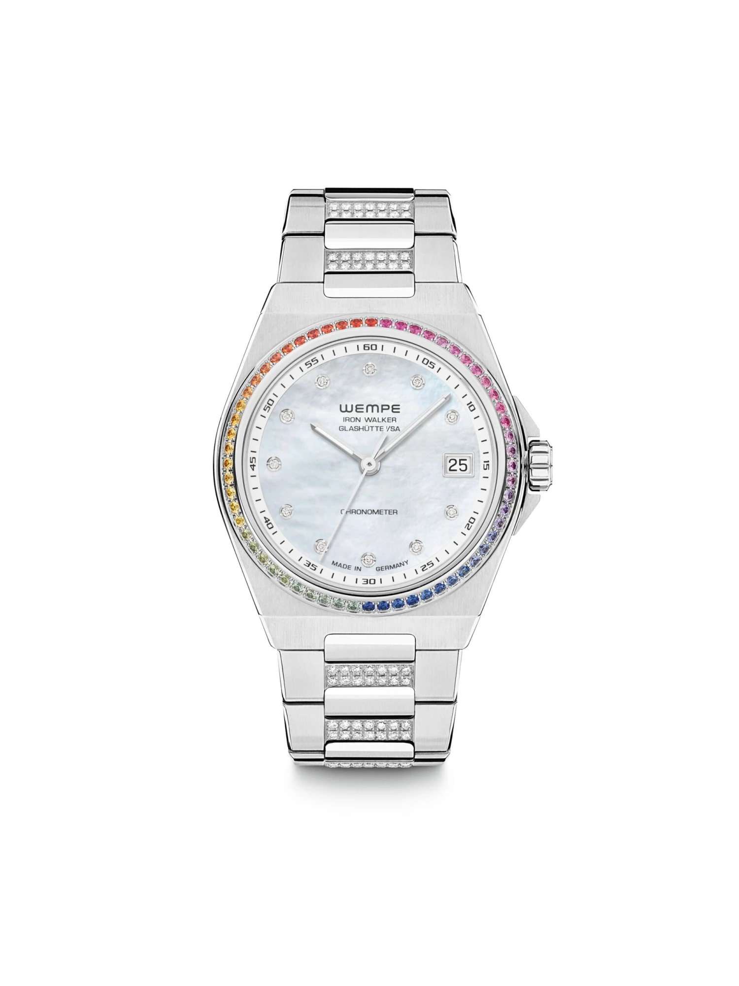 Robust, yet elegant and in this stainless-steel version additionally provided with a special radiance. As an absolute highlight, the Iron Walker Automatik 36 (Ref. WI100020) presents gemstones as far as the eye can see. Framed by a bezel set with 60 brilliant-cut diamonds, eleven diamonds sparkle instead of the usual stick hour markers on the bright mother-of-pearl dial with a date display at three o’clock. The stainless-steel bracelet of the 36-millimeter ladies’ model is pavé-set with a total of 168 preciously sparkling brilliant-cut diamonds. The timepiece, which is certified as a chronometer in accordance with DIN 3159 and comes with a glamour guarantee, is powered by a Swiss self-winding movement with an impressive power reserve of up to 56 hours.