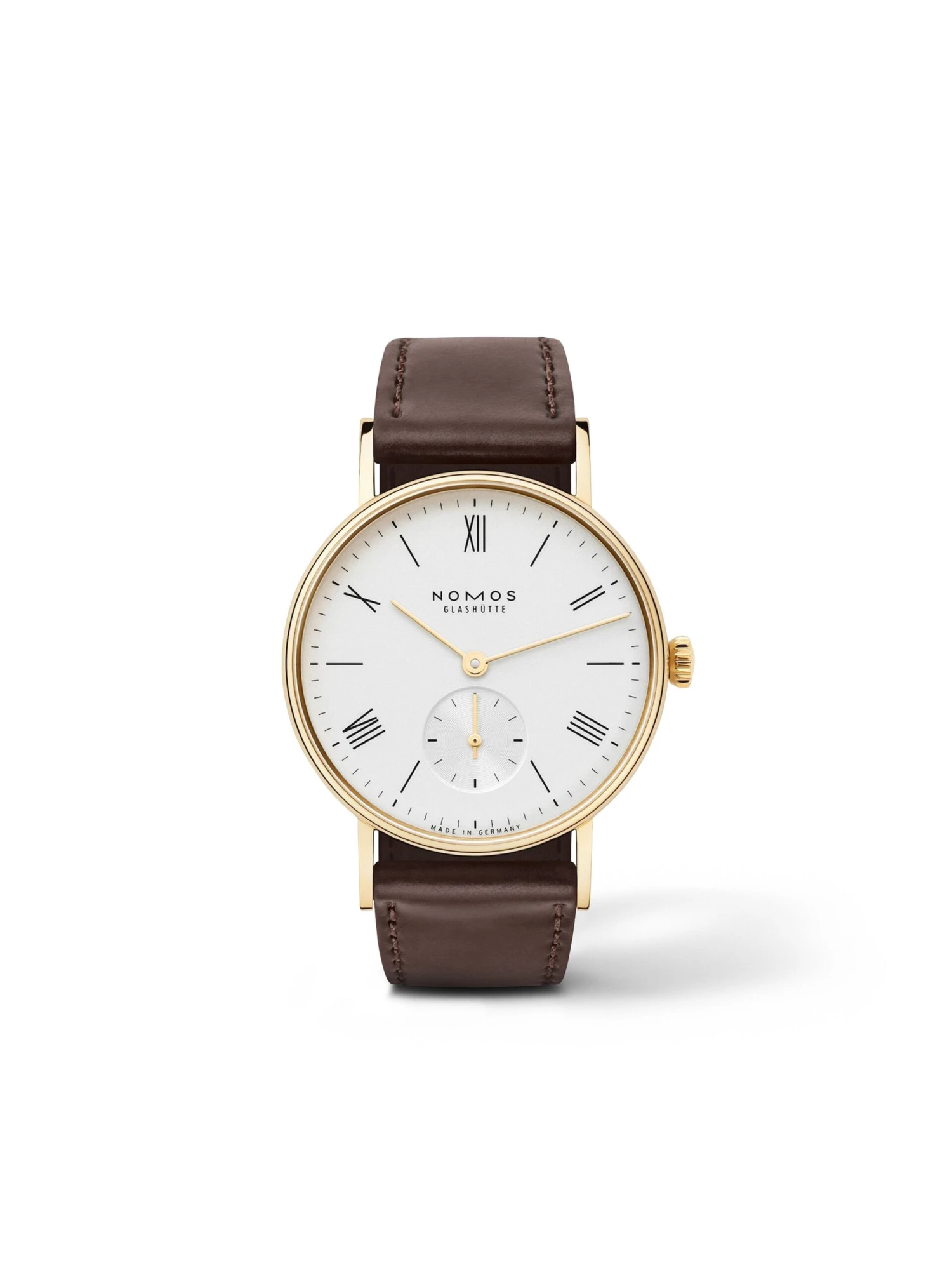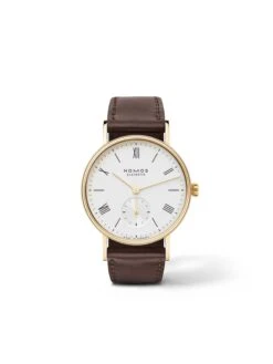 The Ludwig is considered the most classic model from Nomos Glashütte thanks to its Roman numerals and the railroad minute scale on the edge. The case of the Ludwig Gold 33 Ref. 210 is made of 18k Gold. With a diameter of 33 millimeters and a height of only 6.6 millimeters, it also fits snugly around smaller wrists. The golden hands above the galvanized, white silver-plated dial contribute to the distinguished appearance of this two-hand watch. It ticks to the rhythm of hand-wound movement Alpha, made in-house just as all of this watchmaker’s calibers are. The wristwatch is fitted on a brown leather strap made from Horween Genuine Shell Cordovan.