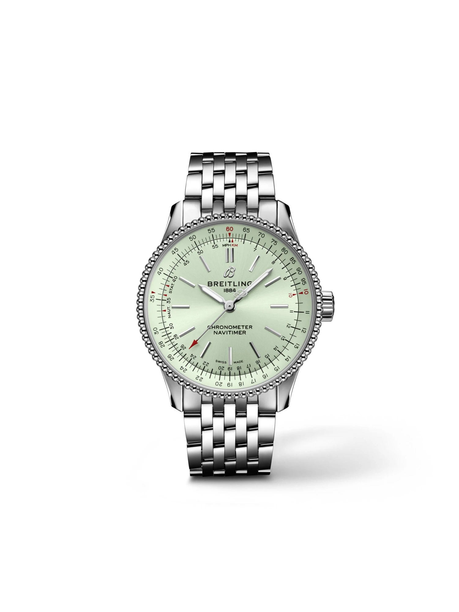 One of the most popular aviator watches since 1952 – now also available for ladies: The smallest model in the legendary Breitling Navitimer collection also impresses across the board with its 35-millimeter diameter case. The Navitimer Automatic 35 Ref. A17395361L1A1 in stainless steel design features a very attractive sporty size for the more delicate female wrist. As a discreet interpretation of the original watch, the chronometer has the style-forming characteristics of this icon. This includes the circular slide rule for calculating navigation data and the beaded bezel that can be rotated in anticlockwise direction. It surrounds the mint green dial, which is also very easy to read at night thanks to the Superluminova coating on the hands. The impressive timepiece is fitted on a seven-row stainless steel bracelet and powered by self-winding movement Breitling 17.