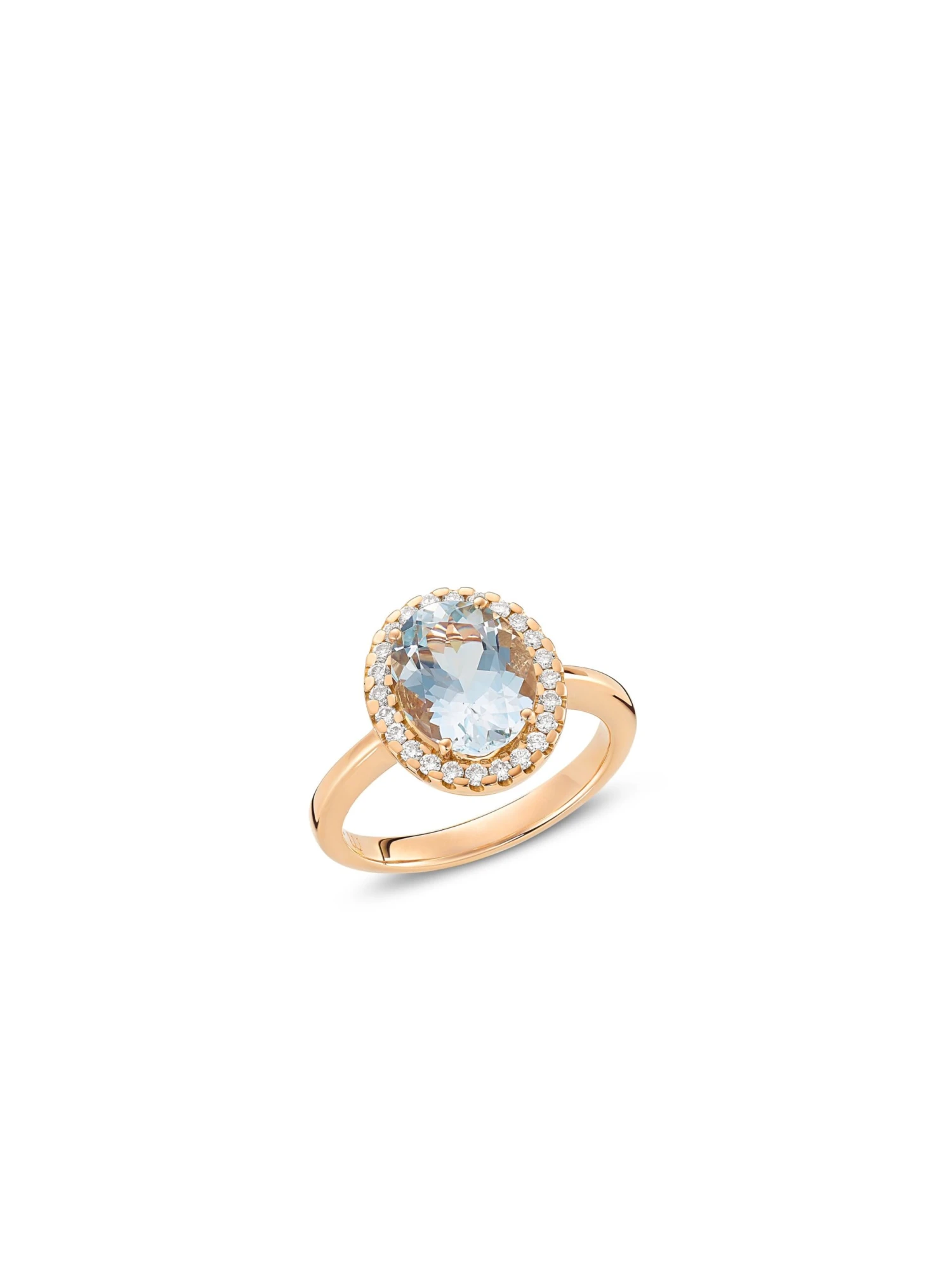 The timeless composition of the Opulence by Wempe Statements ring is both delicate, yet strong. Encircled by an oval wreath of 24 brilliant-cut diamonds of a total 0.24 ct, sparkling in the center of the jewelry piece is an aquamarine of 2.15 ct. The warm 18k rose gold highlights the sophisticated shine of the faceted colored gemstone and emphases its symbolism for love, purity and happiness.