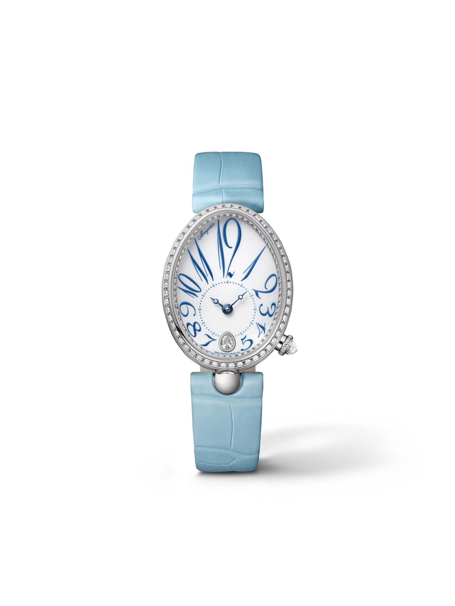 The Breguet Reine de Naples 8918 (Ref. 8918BB/28/964/D00D) enchants with its sparkling combination of first-class mechanics and sophisticated jewelry. The timepiece, which measures 28 x 36 millimeters and is made of 18k white gold, features a dial made of “Grand Feu” enamel with Arabic Breguet numerals and an hour and minute design that is shifted to six o’clock. A total of 118 diamonds set radiant highlights on the dial flange, bezel, and crown. Inside the case, there is self-winding manufacture caliber 537/3, which can be admired through a sapphire crystal caseback. A light blue alligator-skin strap stylishly completes the exquisite look.