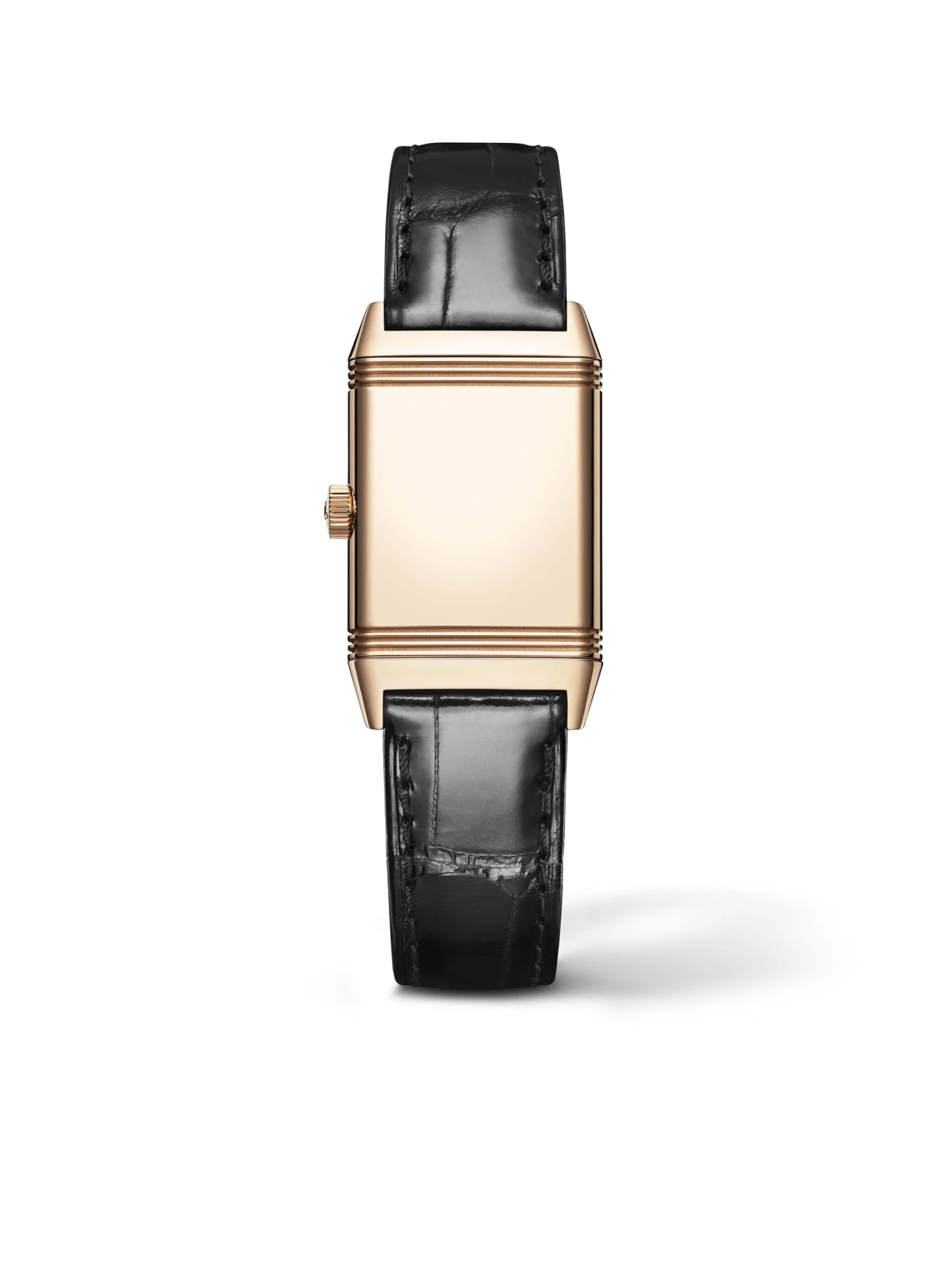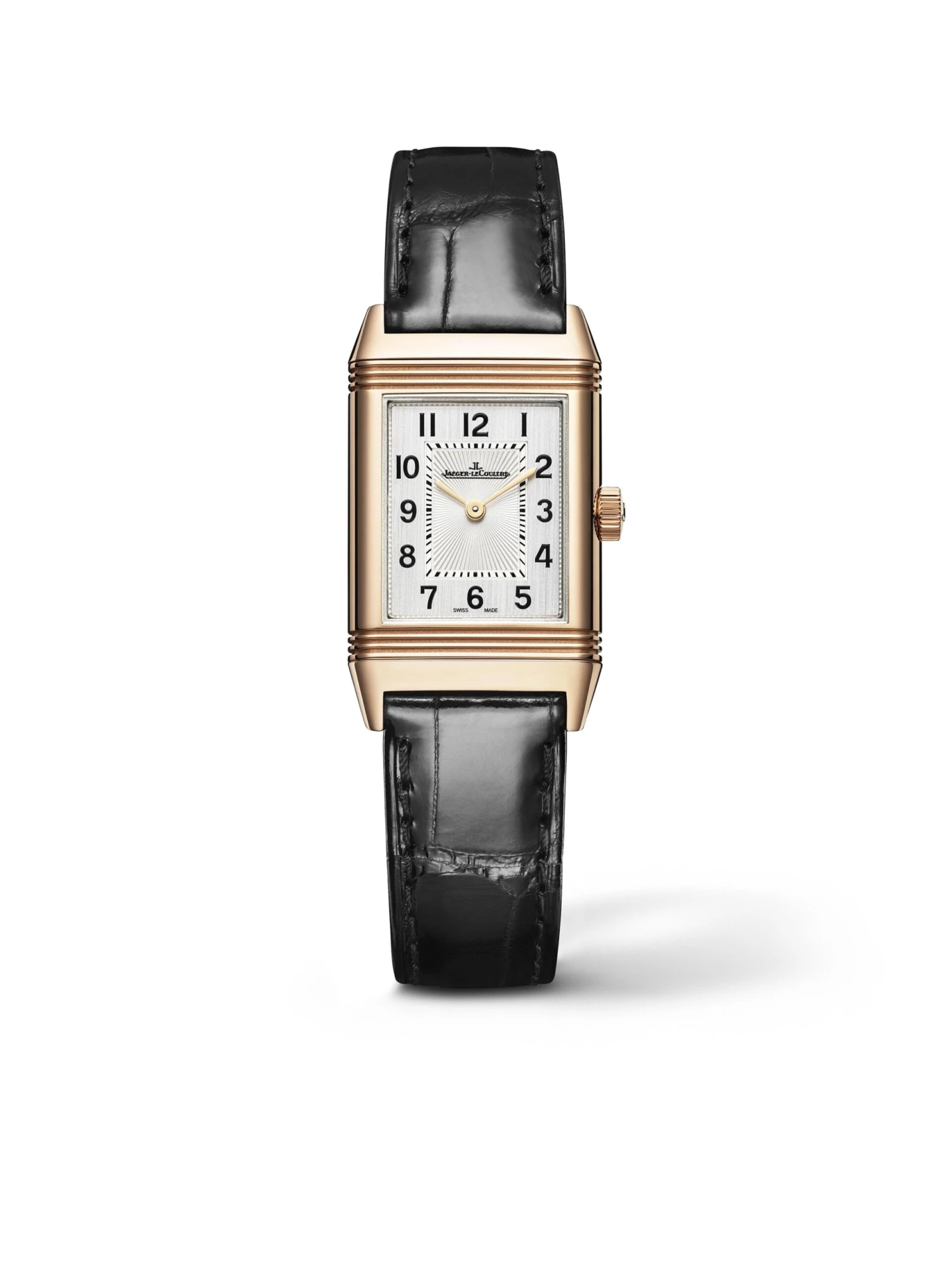 Timeless elegance combined with legendary Art Deco elements – featuring a silver-gray dial with guilloché and vertical satin finish and gold baton hands, the Reverso Classic Small Monoface in rose gold dominates the angular watch segment. The classic case with characteristic Godrons is water-resistant to 3 bar and houses hand-wound manufacture caliber 846/1. Measuring 35.78 x 21 millimeters, the watch fits snugly around slimmer female wrists and convinces even sophisticated enthusiasts of vintage treasures.