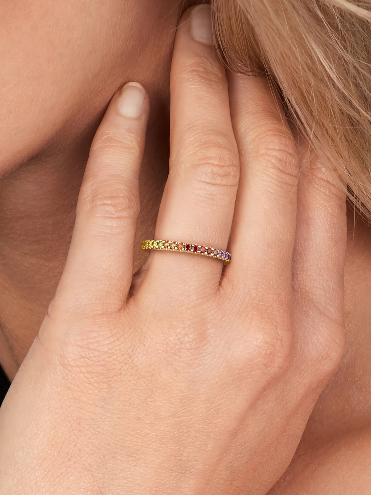 A rainbow raises the spirits and the Blu BY KIM eternity ring in warm 18k rose gold enchants us with its colorful lightness and reminds us of our last summer vacation. The 37 prong-set brilliant-cut diamonds with a total carat weight of 0.70 ct. make us dream of warm sunshine on our skin and carefree sundresses. Worn as a ring enhancer, this color miracle is the perfect complement for every declaration of love.