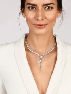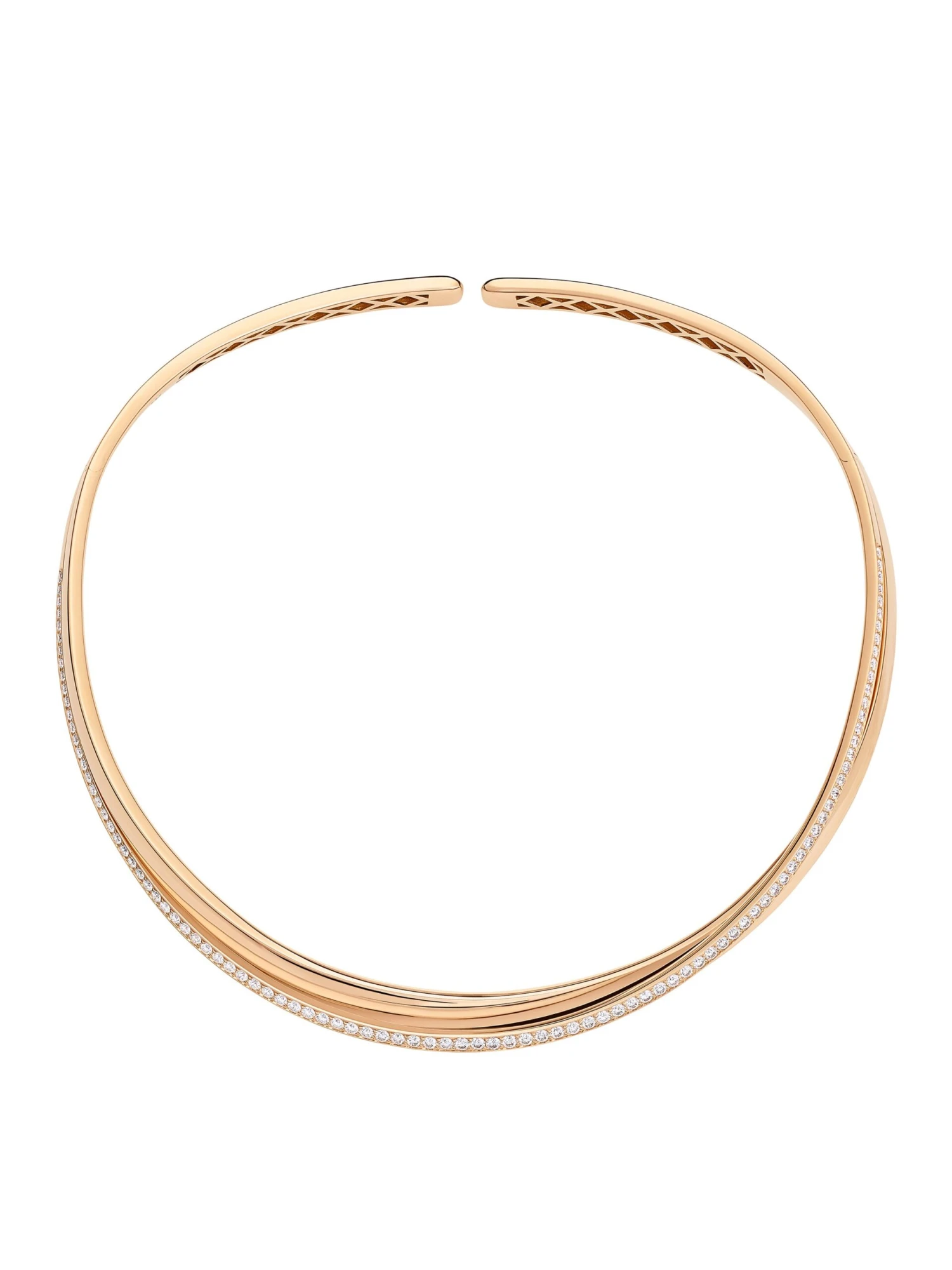 With its clear design, the Uptown by Wempe Statements necklace loops around the neck like an architectural highlight. Its mirror-smooth 18k rose gold surface reflects a curved diamond stripe of 100 brilliant-cut diamonds with a total carat of 3.00 ct. The dynamic design language of the modern hoop necklace evokes a night-time highway with its endless streams of lights. It is a fast-paced jewelry piece with the energy of a big city metropolis constantly waiting to be rediscovered.