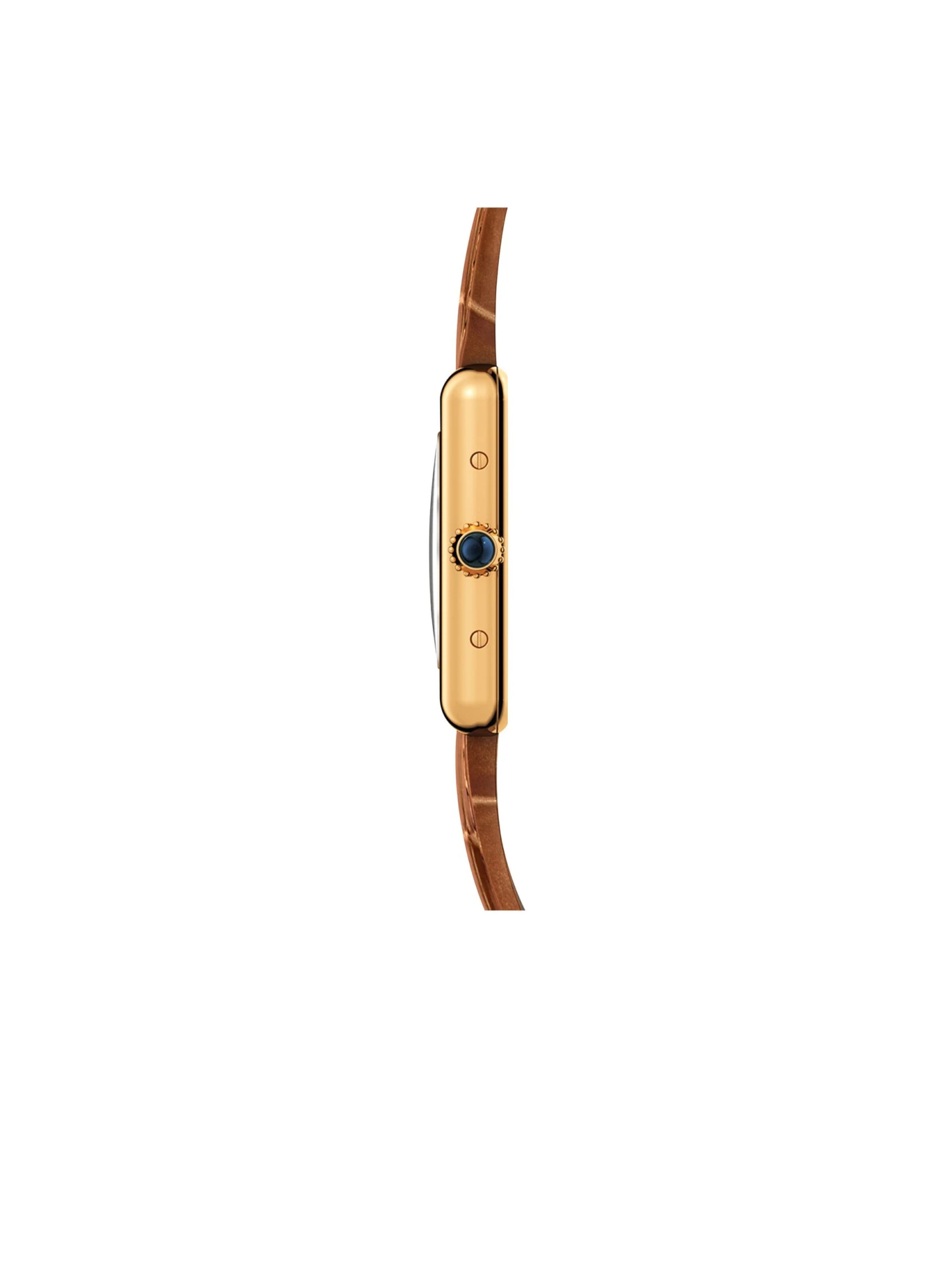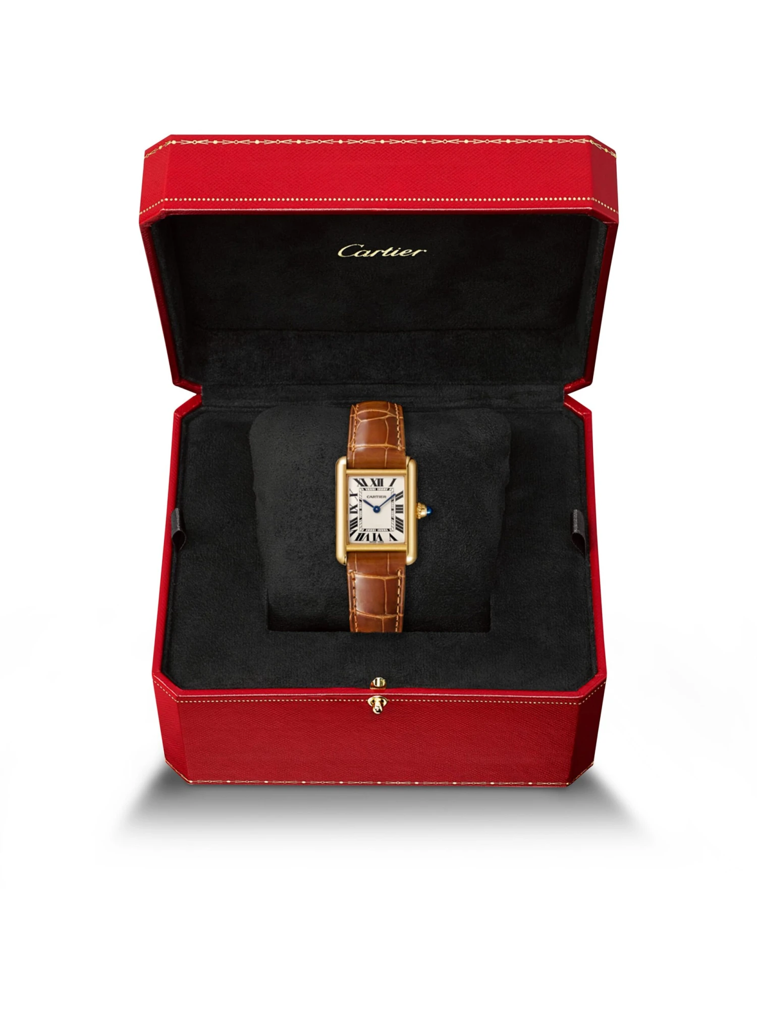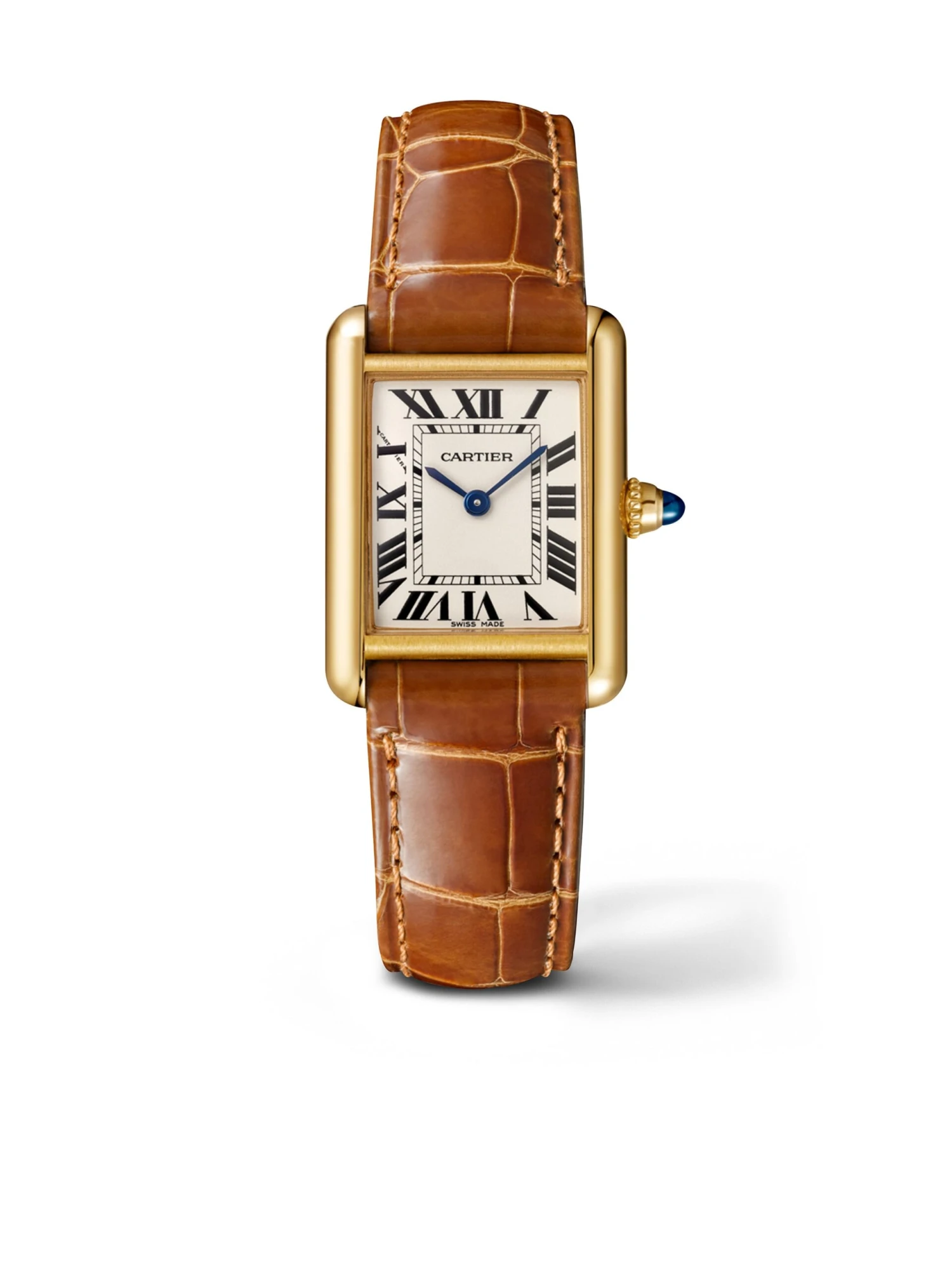 Tank Louis Cartier watch, small model, quartz movement. 18K yellow gold (750/1000) case, beaded crown set with a sapphire cabochon, silver-grained dial, blued-steel sword-shaped hands, mineral crystal, alligator-skin strap 18K yellow gold (750/1000) ardillon buckle. Case dimensions: 29.5 mm x 22 mm, thickness: 6.35 mm. Water-resistant up to 3 bar (30 meters/100 feet).