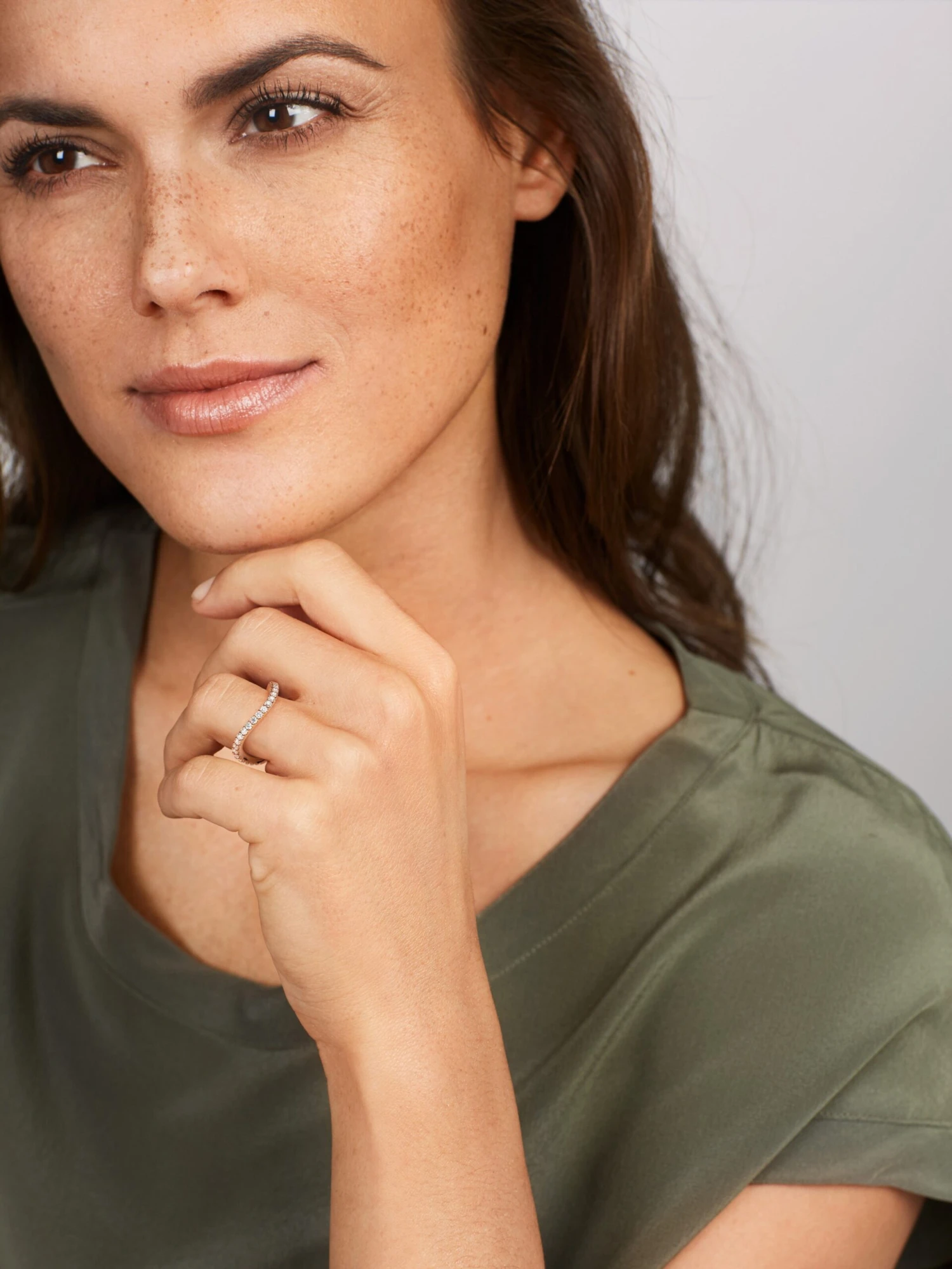 The dainty Voyage BY KIM ring encircles the finger like a wave. 21 brilliant-cut diamonds 0.42 ct in total line up on a band made of 18k rose gold – as if they were reflections of light on the sea. The matching-color design allows the stones and precious metal to meld into one elegant unit making the ring a timelessly beautiful favorite piece despite its extravagant form.