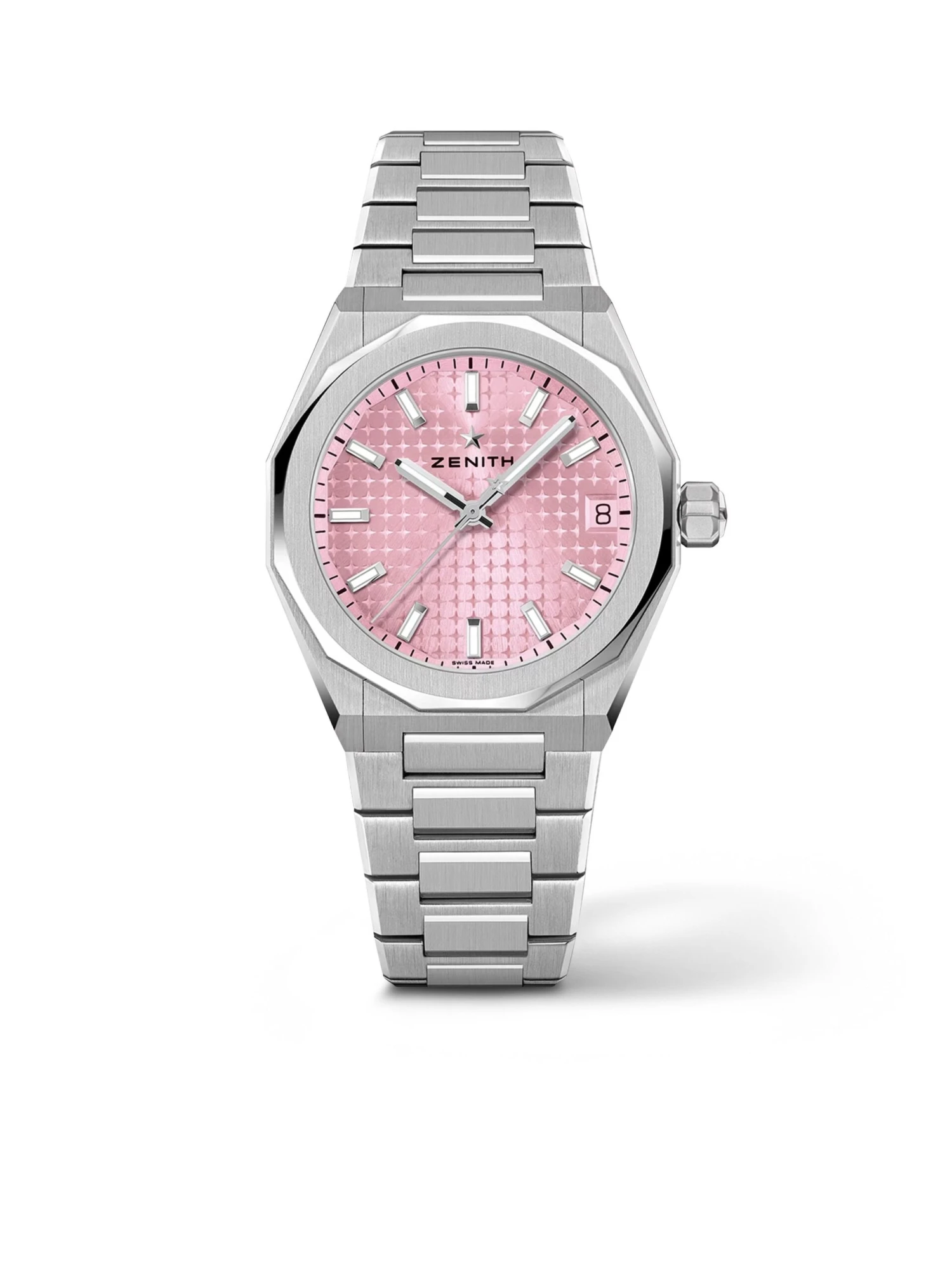 With its 36-millimeter stainless steel case, the feminine Zenith Defy Skyline 36 (Ref. 03.9400.670/18.I001) is a testament to particular elegance. The pink sunburst dial has an interesting depth thanks to its four-pointed star pattern and refers to the model’s design origins in the 1960s through the use of the former Zenith logo. Inside the case, there is self-winding manufacture caliber ELITE 670 with a power reserve of up to 50 hours. This ladies’ model, which is water-resistant to 100 meters and has a date display at three o’clock, is fitted on a classic stainless-steel bracelet, that thanks to a quick-change system, can easily be replaced by the additional rubber strap with a pink pattern